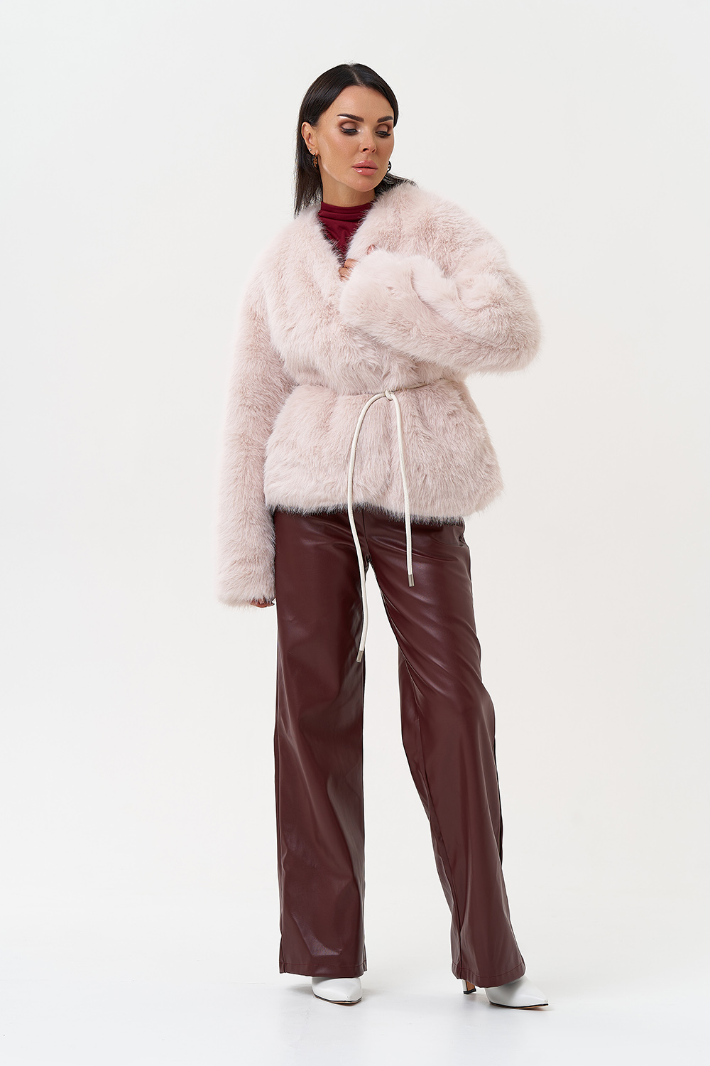 Фасон - прямой Длина изделия - 60 см Цвет - розовый (персиковый) Материал - экомех Состав полотна - полиэстер 100% Подкладка - полиэстер 100% Вид застежки -крючки, пояс Вид ворота - V-образный Фасон рукава - спущенное плечо, длинный |